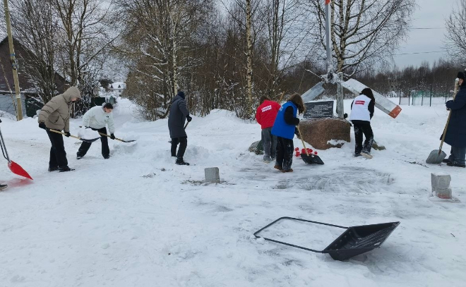 Совет Ветеранов Рахьи расчистил от снега памятник героям ВОВ